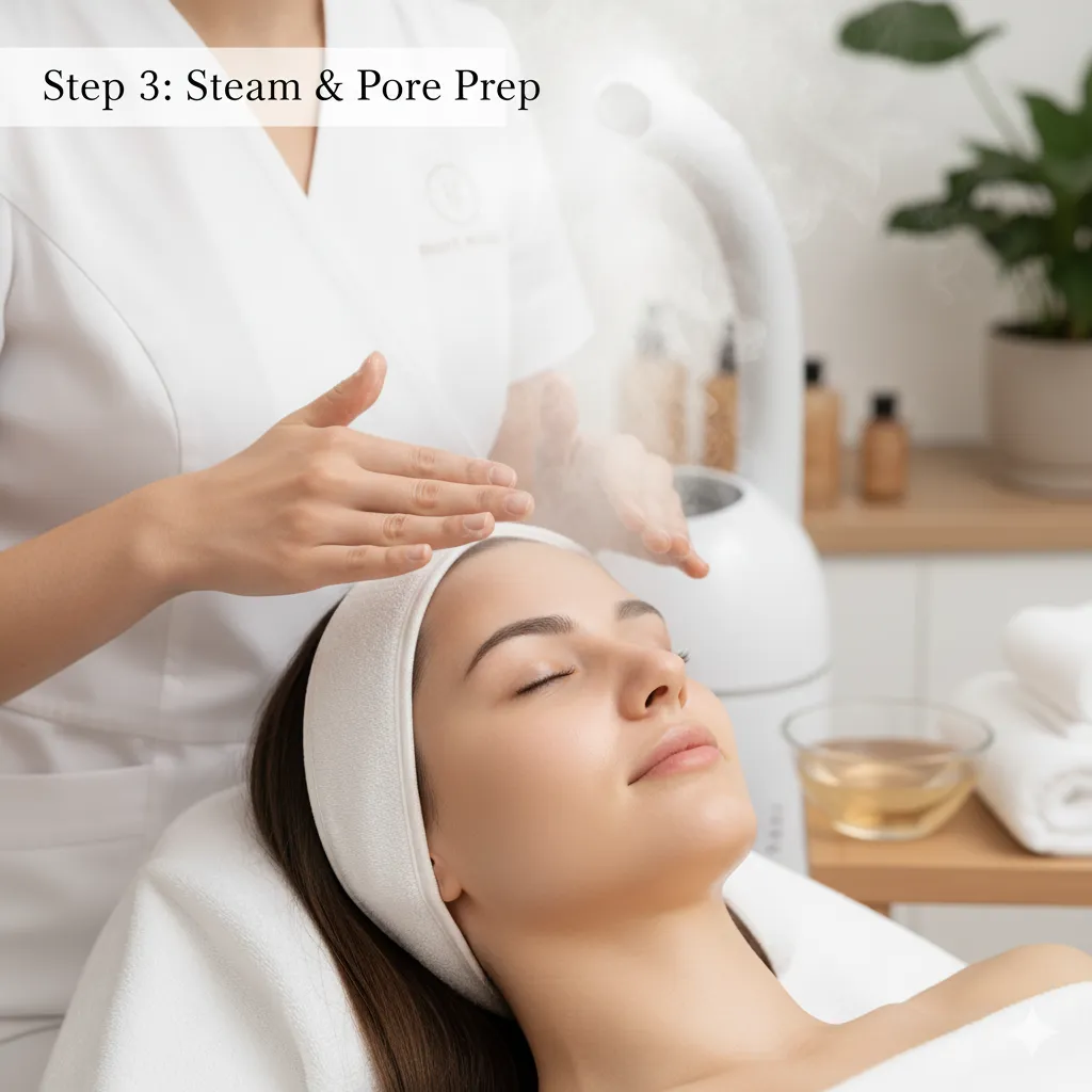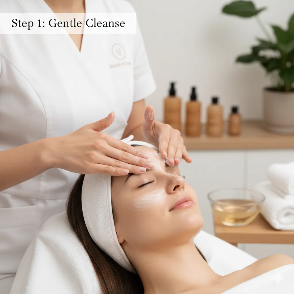 We begin with a soothing cleanser to remove makeup, oil, and impurities from your skin.